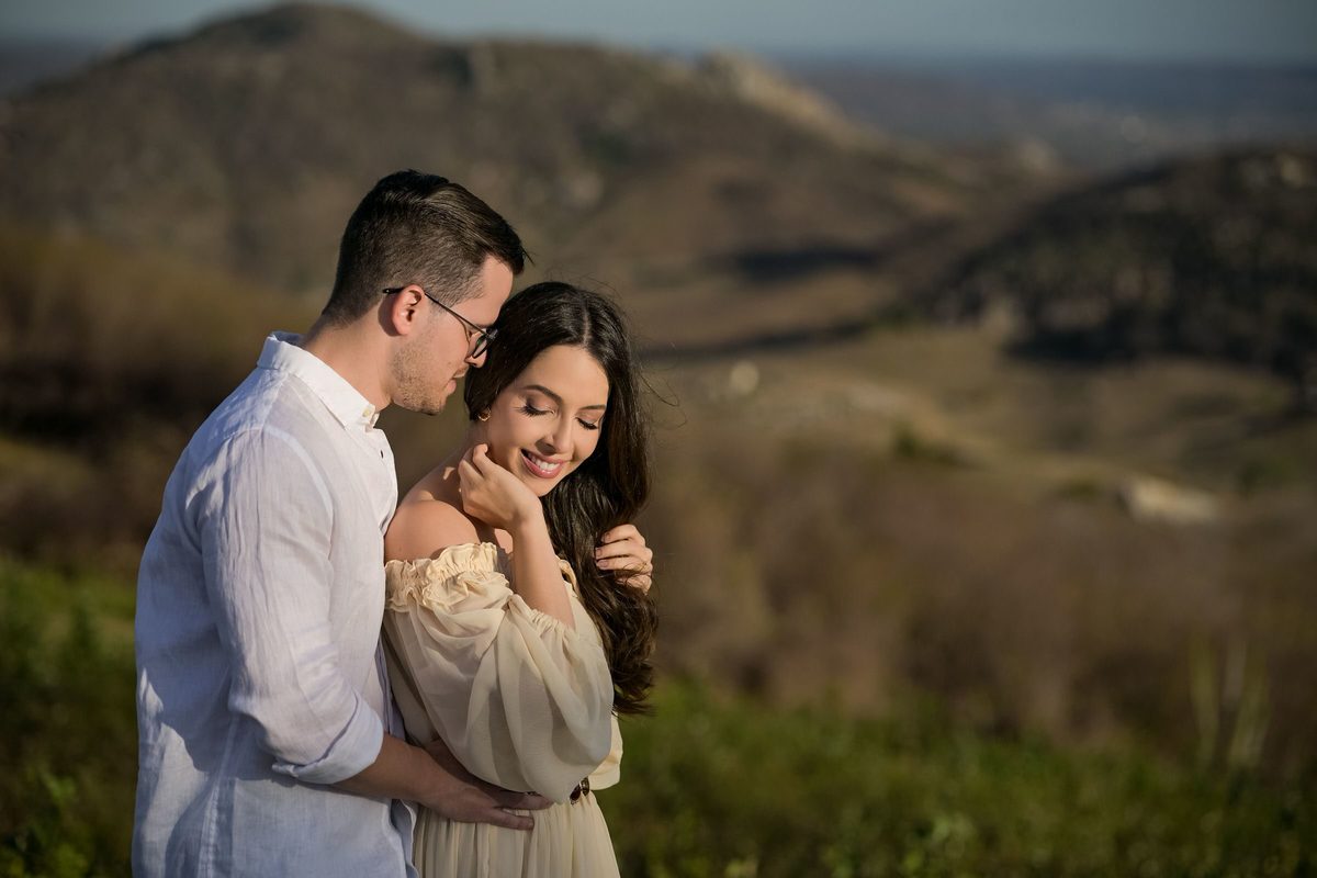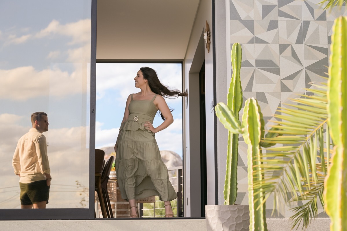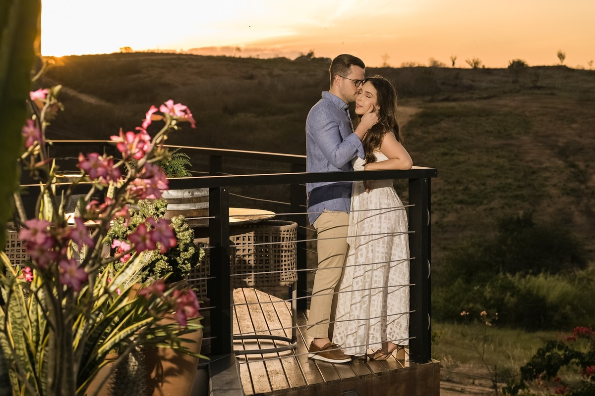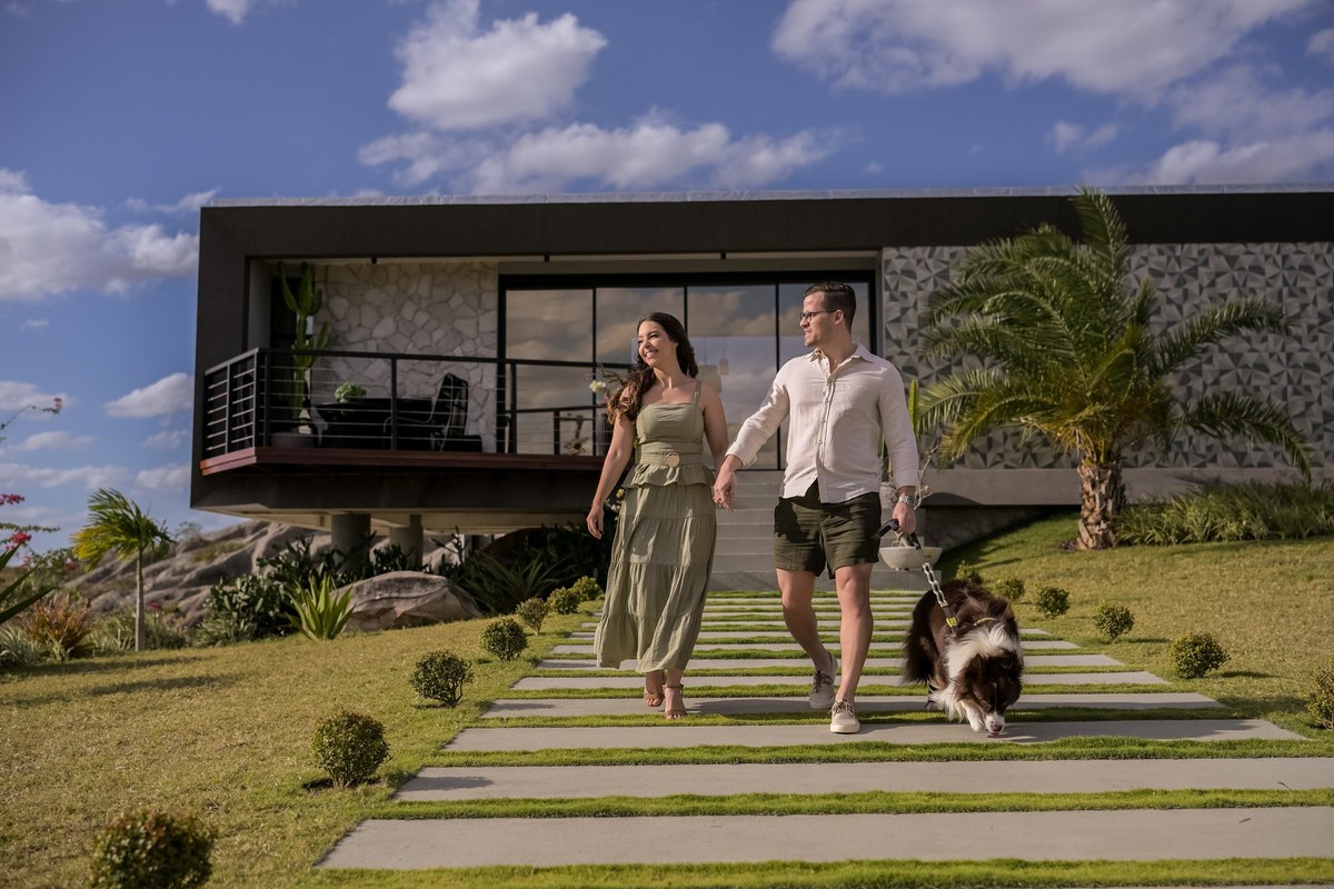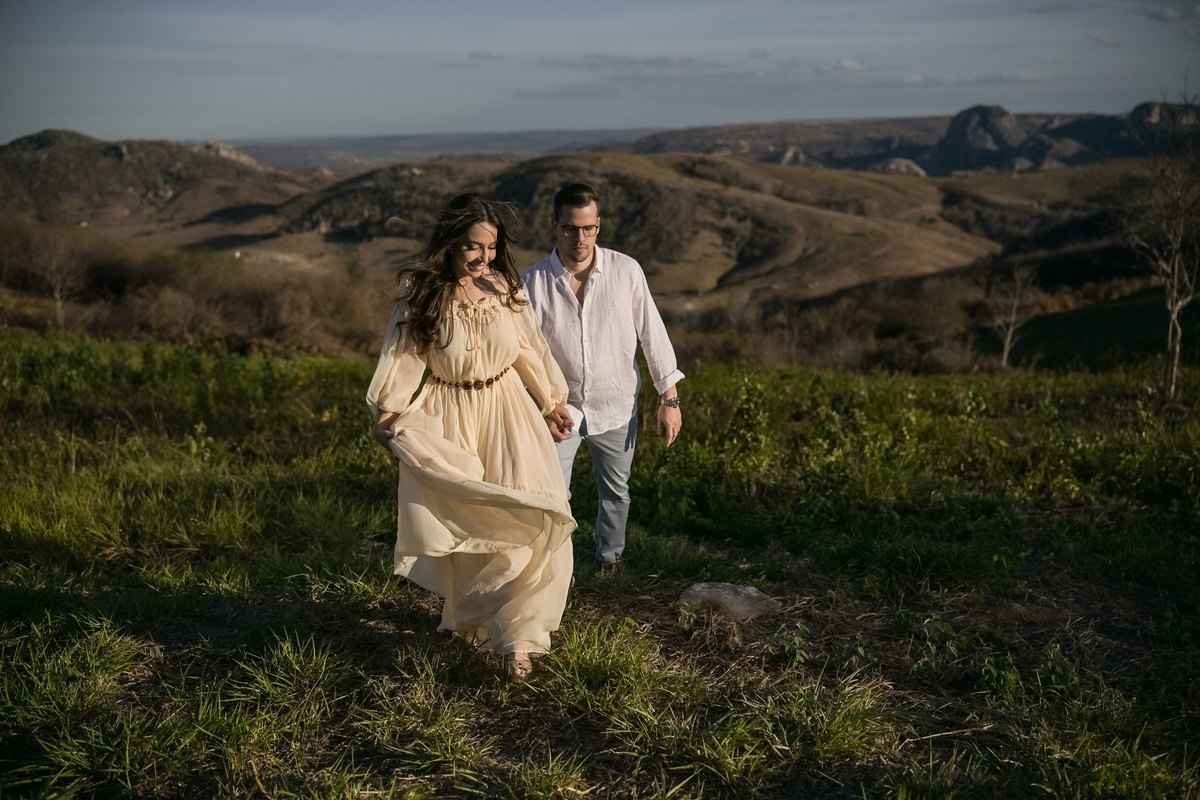 O ensaio de Marjorie e Fernando aconteceu na Serra de São Bento, em um cenário que vai muito além da beleza natural. Foi na casa dos pais de Marjorie — um refúgio construído com o amor e o olhar detalhista de seu pai, o advogado Kaleb — que a história desse casal ganhou moldura.