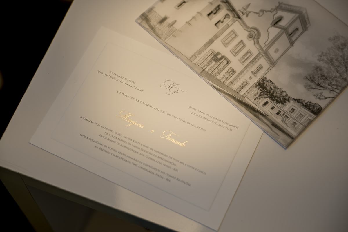 O dia de Marjorie e Fernando começou com a leveza de quem sabe que está exatamente onde deveria estar. Cada detalhe já carregava significado desde o início. O convite, pensado com carinho, já anunciava que aquele não seria apenas mais um casamento.
