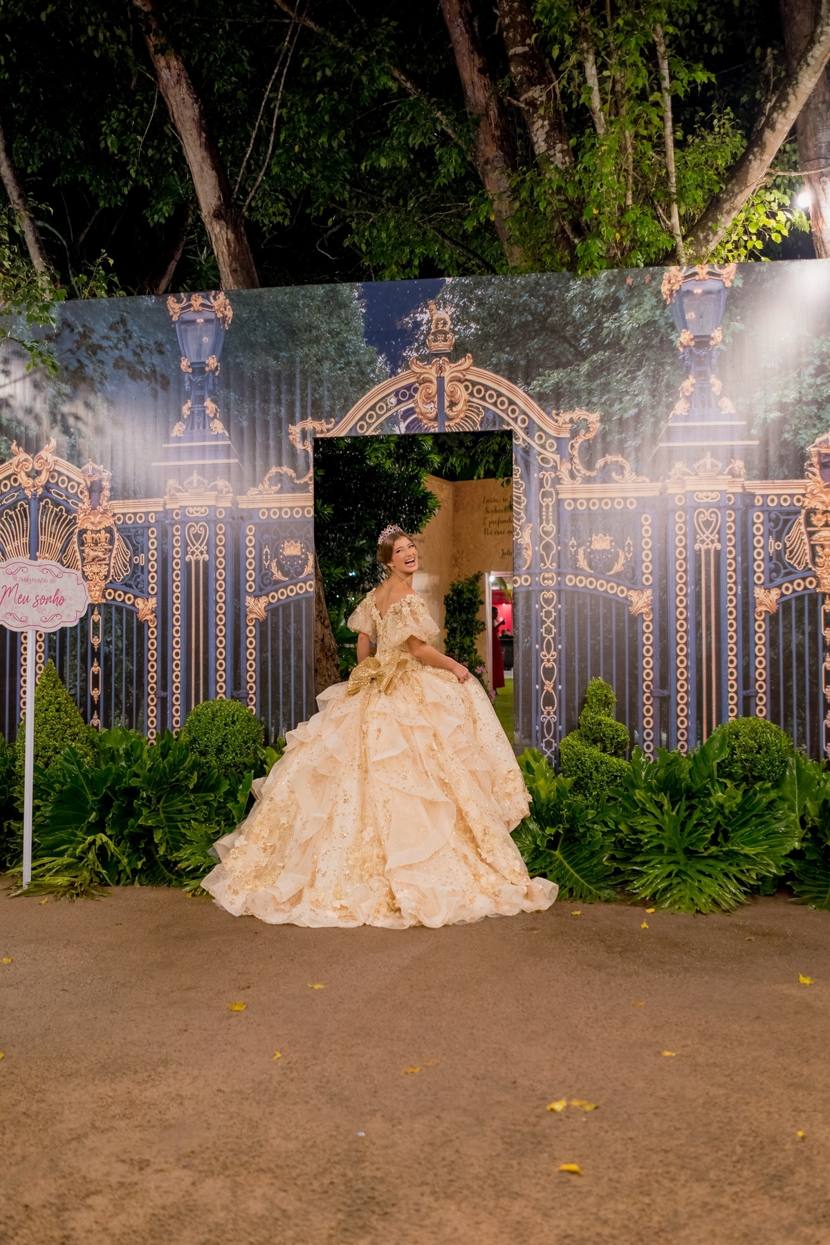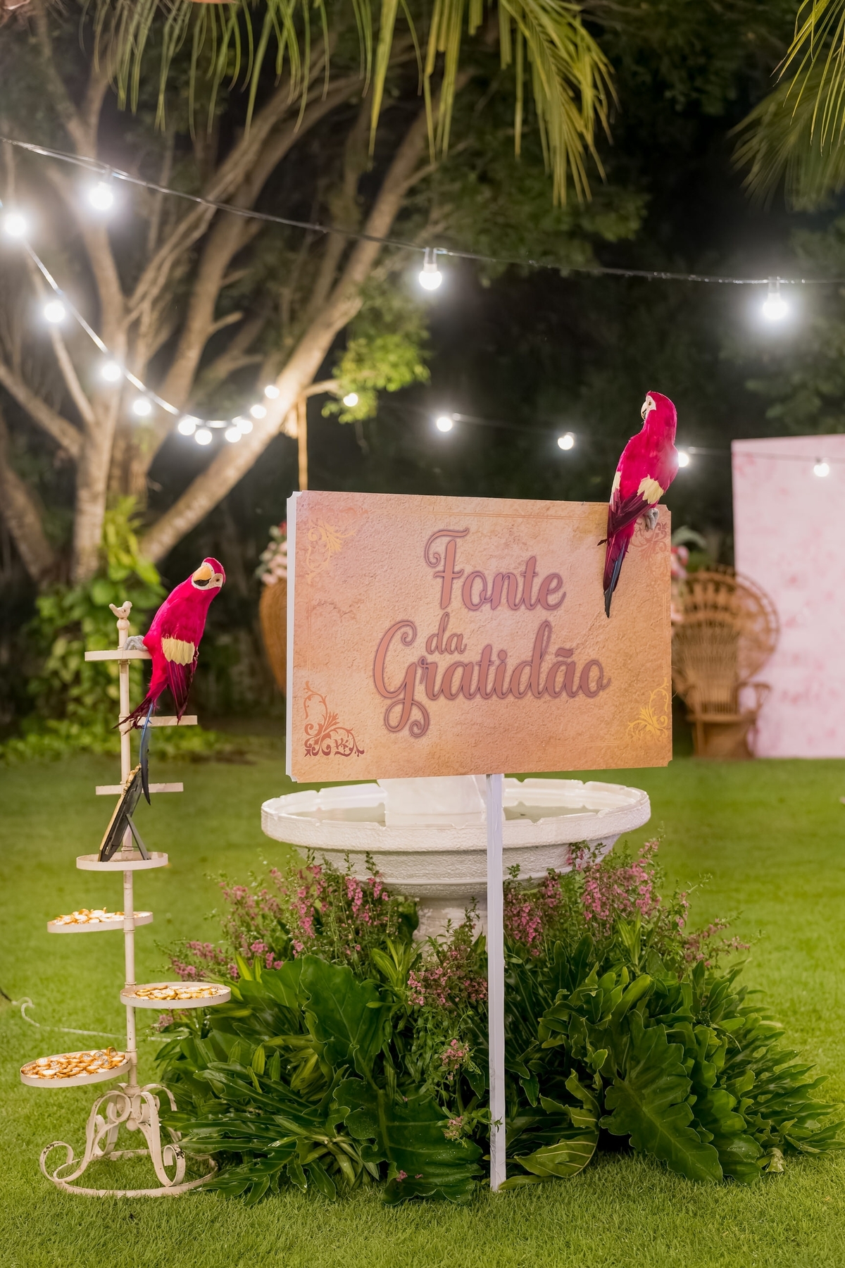 A magia começou a tomar forma quando @hjtemfesta trouxe à vida um cenário digno de uma princesa. O espaço foi iluminado com perfeição por @ajaxsom_iluminacao, criando uma atmosfera mágica que encantava cada convidado. As letras iluminadas da @linear_totensluz destacavam ainda mais esse cenário de sonhos, enquanto a @viveirojardimverde02 instalou a Fonte da Gratidão, onde desejos foram feitos e memórias foram criadas.